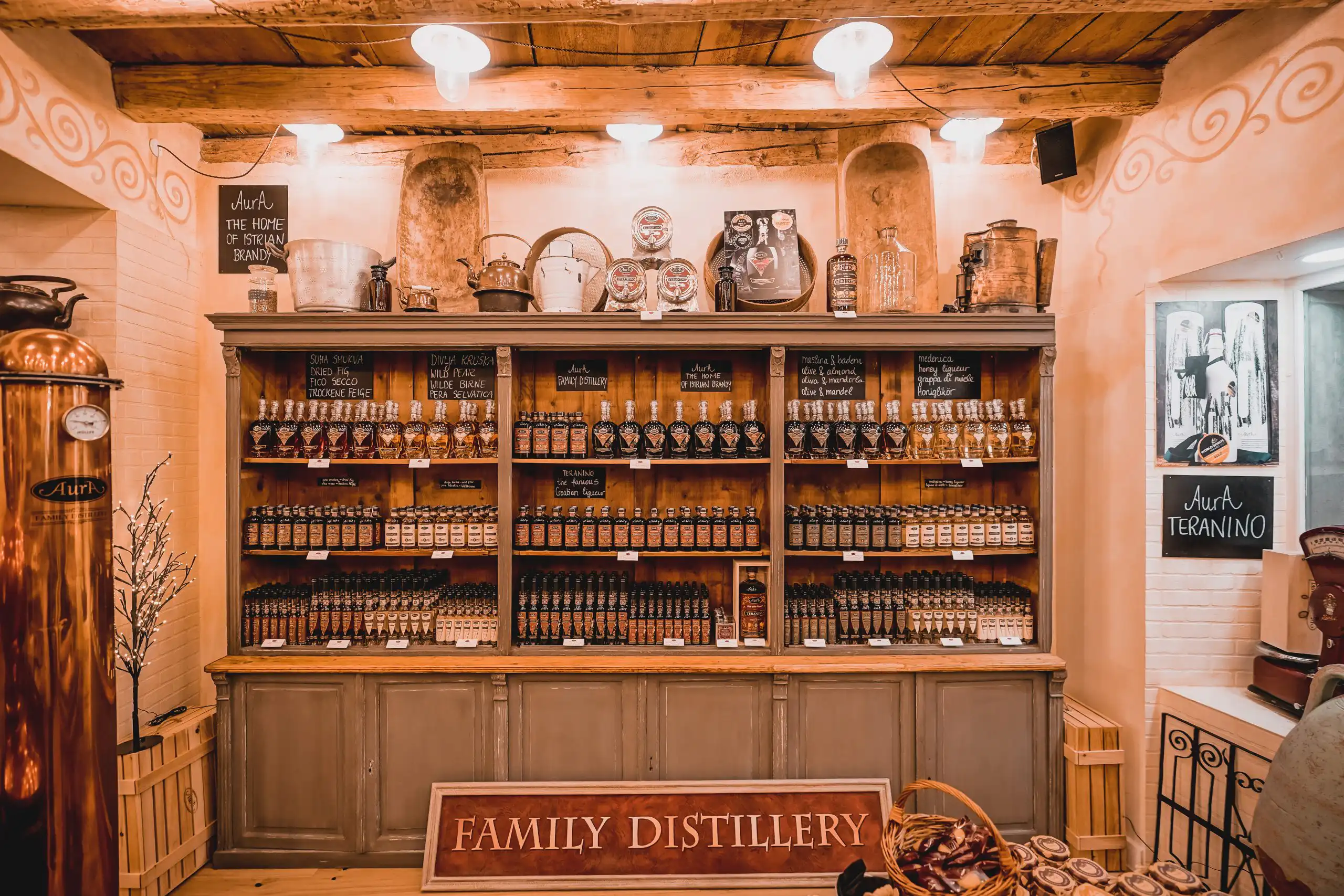 Destilerija Aura danas broji 18 shopova diljem Istre i Kvarnera – u obalnim gradovima, sve do srca unutrašnje Istre, uz to u Splitu i na Murteru te u susjednoj Sloveniji- Ljubljani, Kopru i Izoli. Svaka lokacija dizajnirana je kao mala oaza mira i okusa, idealna za kratki predah od razgledavanja i gužve.