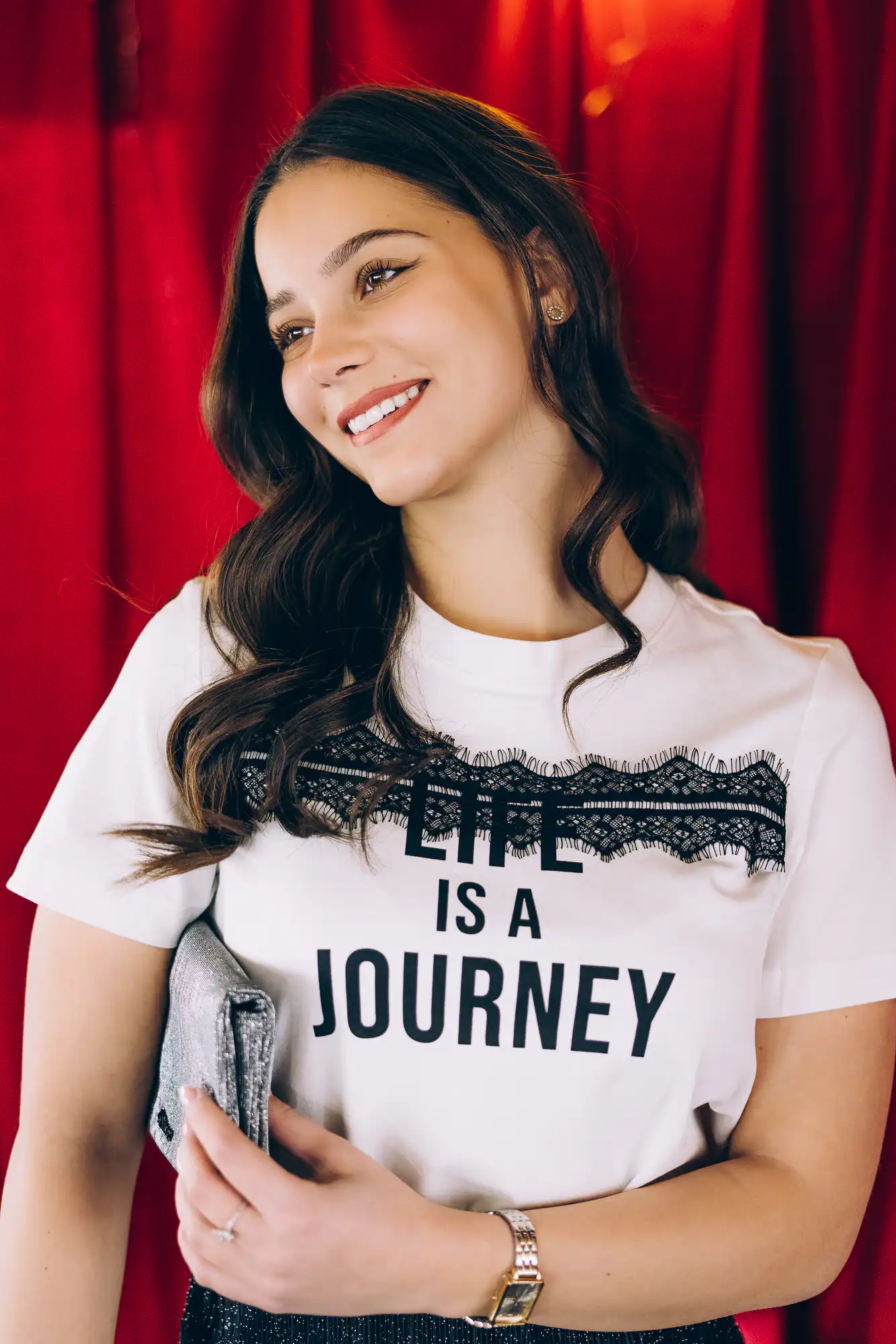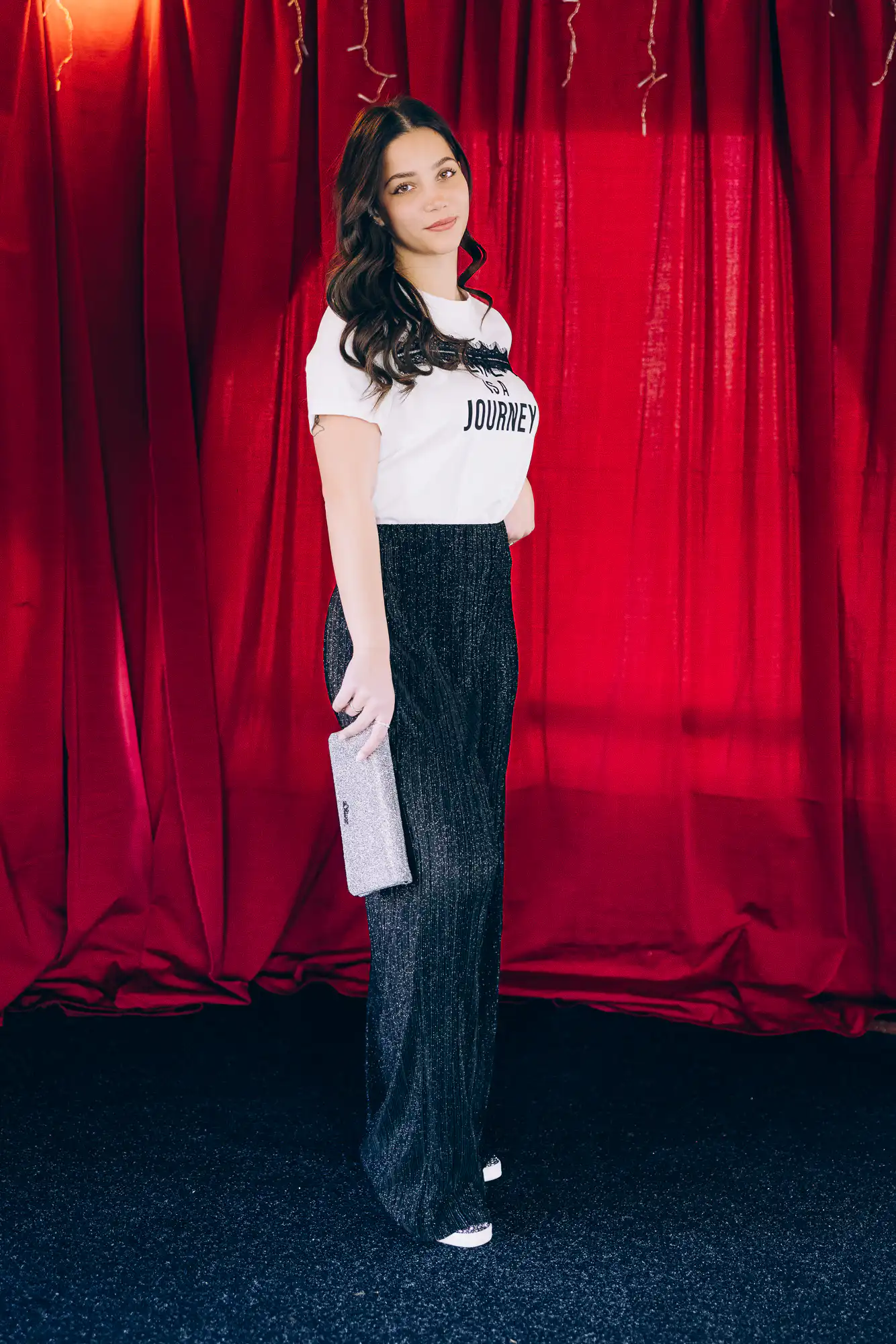 Ključni komadi: crne hlače, majica s porukom i srebrna torba
