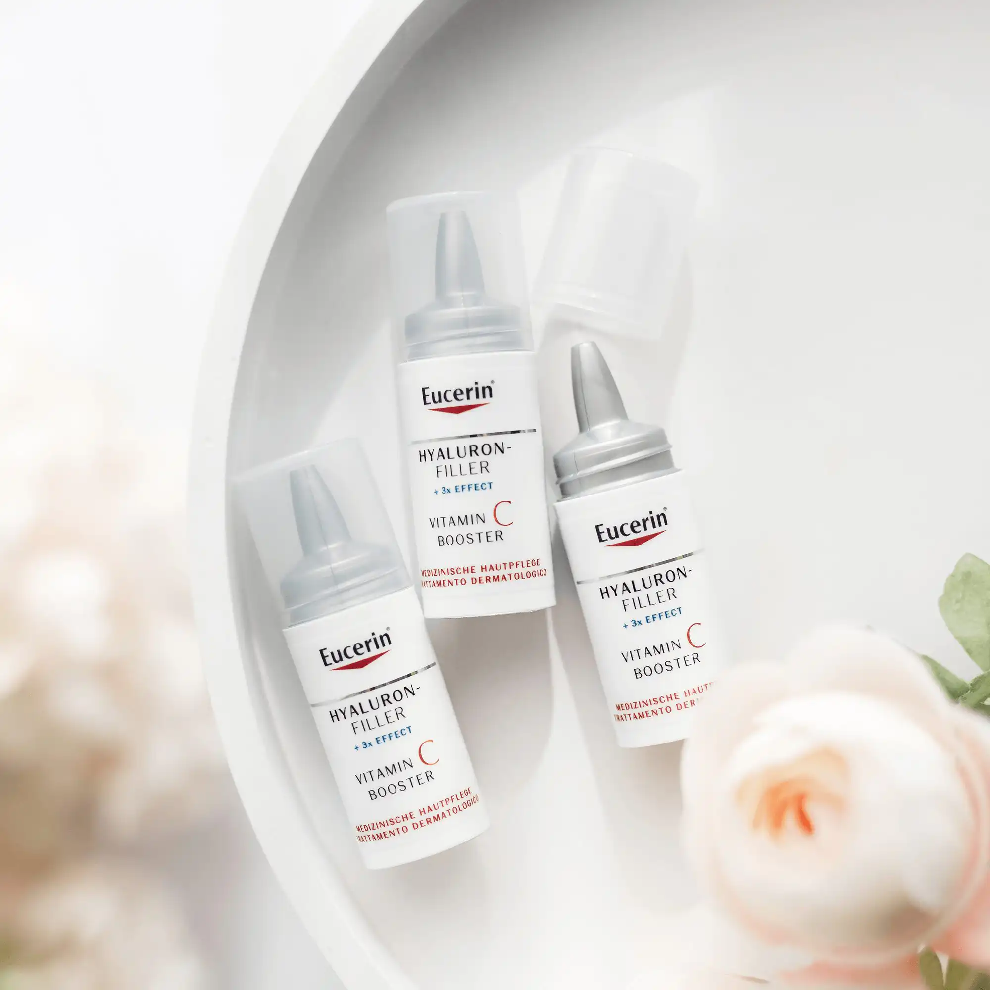 Eucerin Hyaluron-Filler Vitamin C booster s 10% čistog i svježe aktiviranog vitamina C, hijaluronskom kiselinom i likokalkonom A prikladan je za sve tipove kože. Inovativno pakiranje otpušta vitamin C i aktivira njegovu snagu trenutno uz vidljive rezultate u samo sedam dana primjene. Snažni serum s vitaminom C potiče proizvodnju kolagena u stanicama kože, štiti od slobodnih radikala i ispunjava fine linije i bore.