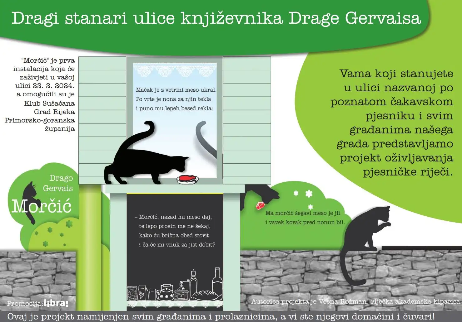 Zahvaljujući prihvaćenom projektu i odobrenim financijskim sredstvima od strane Odjela za kulturu Grada Rijeke, za nekoliko dana, u četvrtak 22. veljače 2024. godine u 12.00 sati, prisustvovat ćemo otvorenju prve umjetničke instalacije pod nazivom “MORČIĆ” koja će biti postavljena na javnoj površini pločnika ulice, uz postojeći ogradni zid ispred višestambene zgrade, točnije u Ulici Drage Gervaisa kod kućnog broja 14. O samom događaju svečanog otvorenja ćemo informirati građane i javnost putem javnih medija, pozivima upućenim predstavnicima nadležnih odjela gradske i županijske uprave koji su pomogli u realizaciji projekta te postavom plakata na vidljivim mjestima duž same ulice, na prostorima Krimeje, Donje Vežice, Trsata i Sušaka te na javnim institucijama u centru grada. Na taj način cjelokupnoj javnosti predstavljamo projekt koji je namijenjen svim građanima našega grada i kraja, svim posjetiteljima Rijeke i slučajnim prolaznicima, a posebno se obraćamo stanarima Ulice Drage Gervaisa kao domaćinima projekta i čuvarima postavljenih umjetničkih instalacija.