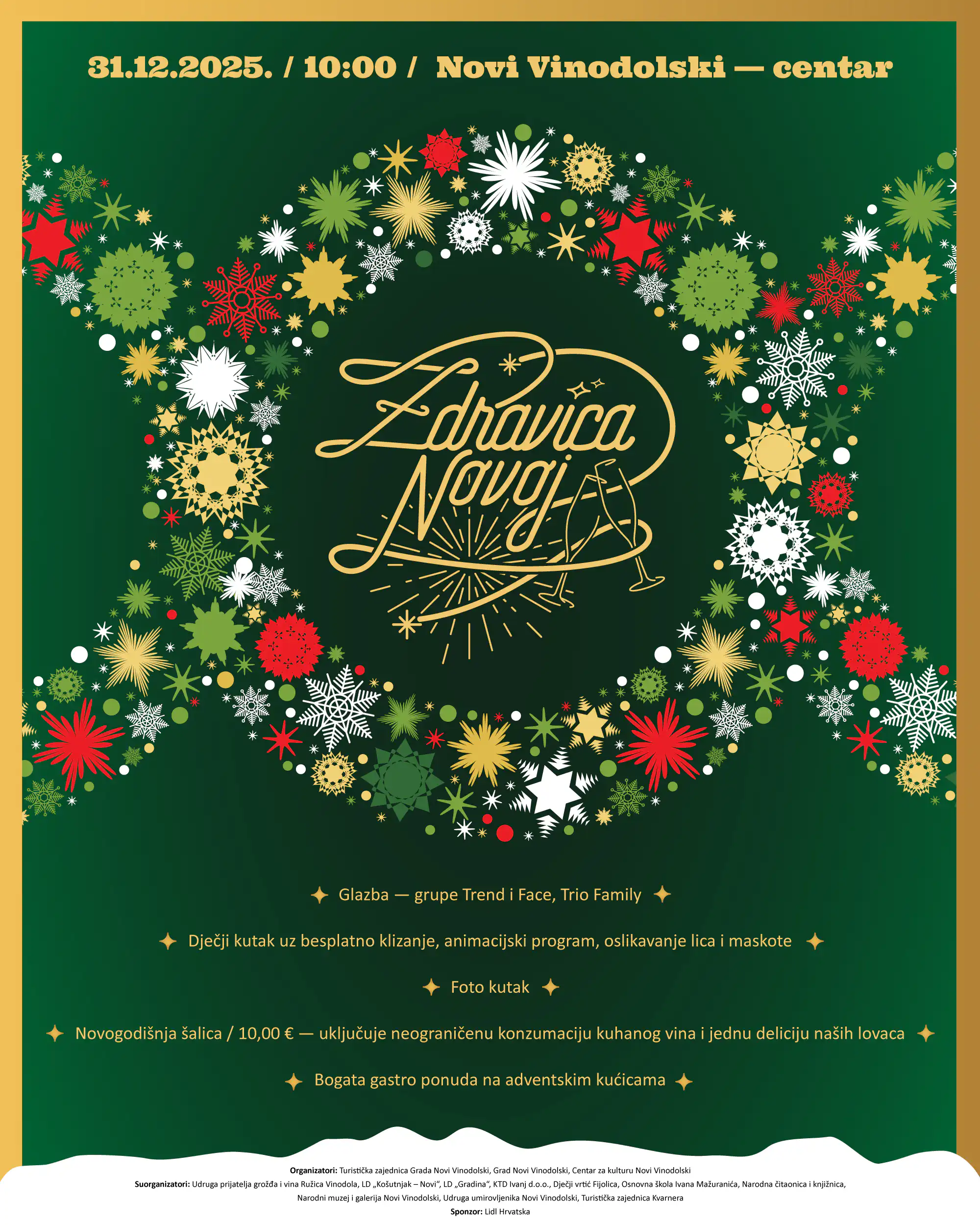 Nakon bogatog i sadržajnog prosinačkog adventskog programa, Novi Vinodolski i ove godine spremno dočekuje kraj godine uz već tradicionalnu i svima omiljenu Zdravicu Novoj. U srijedu, 31. prosinca, centar grada ponovno će se pretvoriti u mjesto dobre energije, druženja i veselja – savršenu uvertiru u novu godinu.