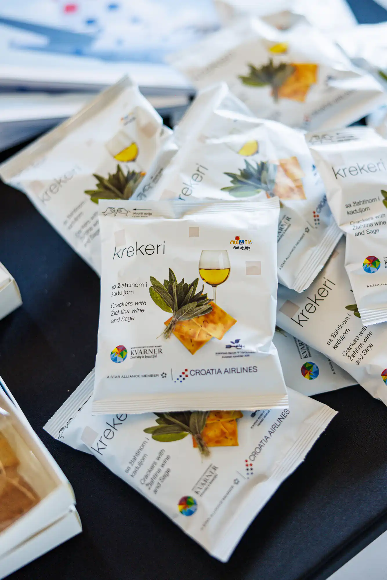 Croatia Airlines svojim će putnicima u domaćem i međunarodnom prometu, u poslovnom razredu, ponuditi veliki snack box u kojem su kobasica s ružmarinom, zelena pasta od maslina, krekeri sa žlahtinom i kaduljom, keksi sa suhim smokvama i keksi s kestenom. Na letovima kraćim od jedan sat nudit će se mali snack box u čijem su sadržaju kobasica s ružmarinom, krekeri sa žlahtinom i kaduljom te keks s kestenom, dok će se putnicima u ekonomskom razredu nuditi krekeri sa žlahtinom i kaduljom.