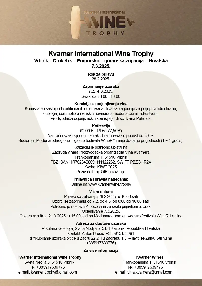 Prepoznavši potrebu za međunarodnim, kvalitetnim, objektivnim i profesionalnim ocjenjivanjem vina u Hrvatskoj te stavljanju naglaska na vina od autohtonih hrvatskih sorti vinove loze, u suradnji s Udruženjem Kvarner Wines (Zadrugom vinara Proizvođačkom organizacijom Vina Kvarnera), 7. ožujka 2025. godine održat će se ocjenjivanje vina „Kvarner International Wine Trophy“.