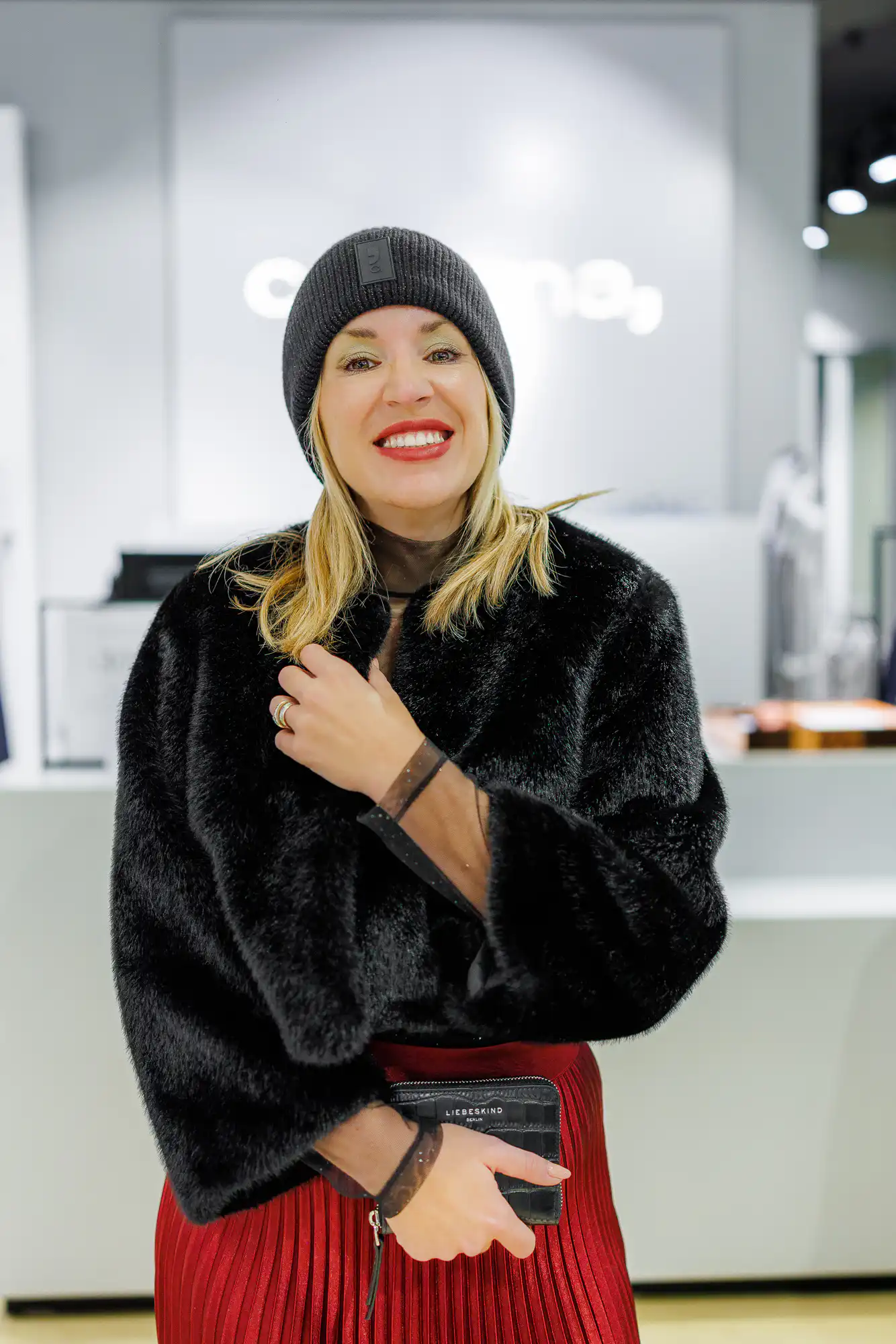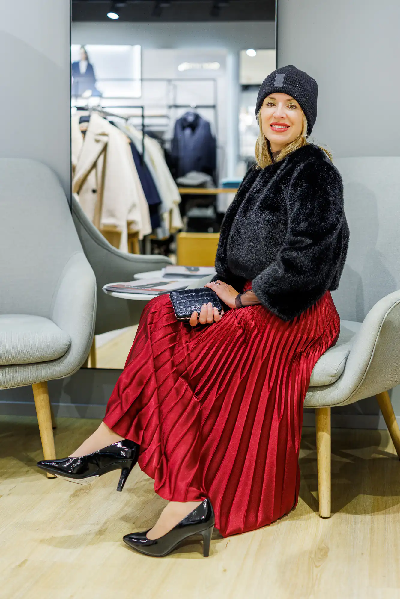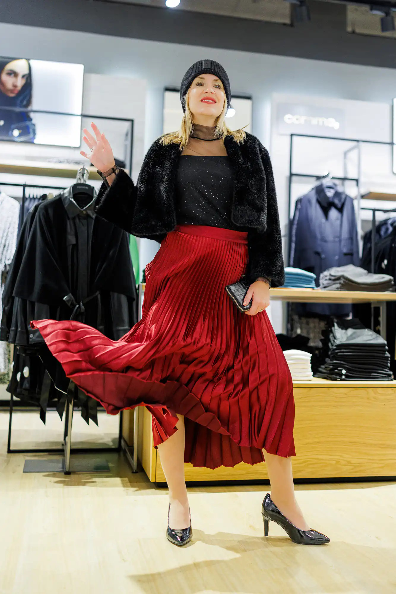 Crvena i bordo boja ove godine su hit. Ipak, posebno se lijepo uklapa u blagdane, a naš je odabir plisirana suknja, crna majica te kratka crna bundica. Kako bi se malo modno poigrali dodali smo i crnu kapu jer… moda je igra! Suknja uvijek doda dodatnu profinjenost svakom izdanju.