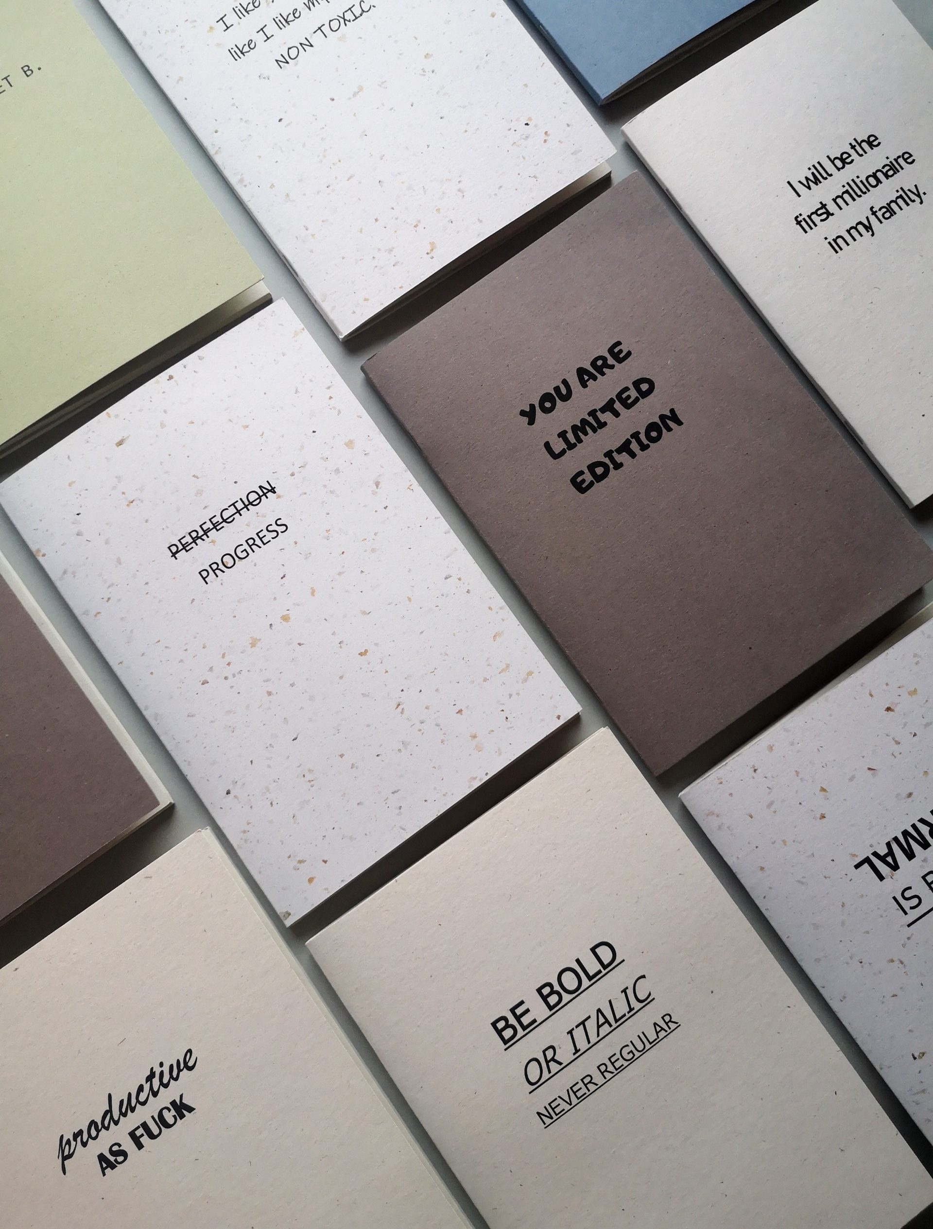 Tekice su, kao i svi naši proizvodi, ručno rađene i napravljene od recikliranih papira koji u svom sastavu imaju ostatke kave, lavande, zemlje, trave ili kakaa. To im daje poseban štih – i vizualno i taktilno.