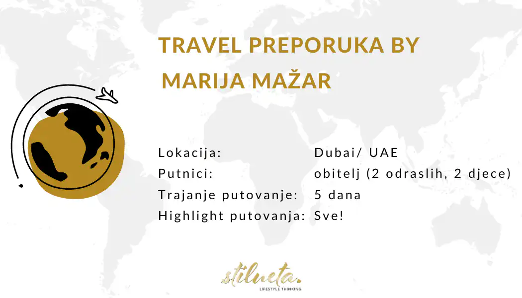 Nastavljamo u egzotičnom tonu travel preporuka, pa je tako današnja gošća urednica Stiluete – Marija Mažar. Ona i njezina obitelj su otputovali u Dubai, potpuno drugačiji svijet od onog na kojeg smo navikli, pa je logično da svoje dojmove podijeli na Stilueti!