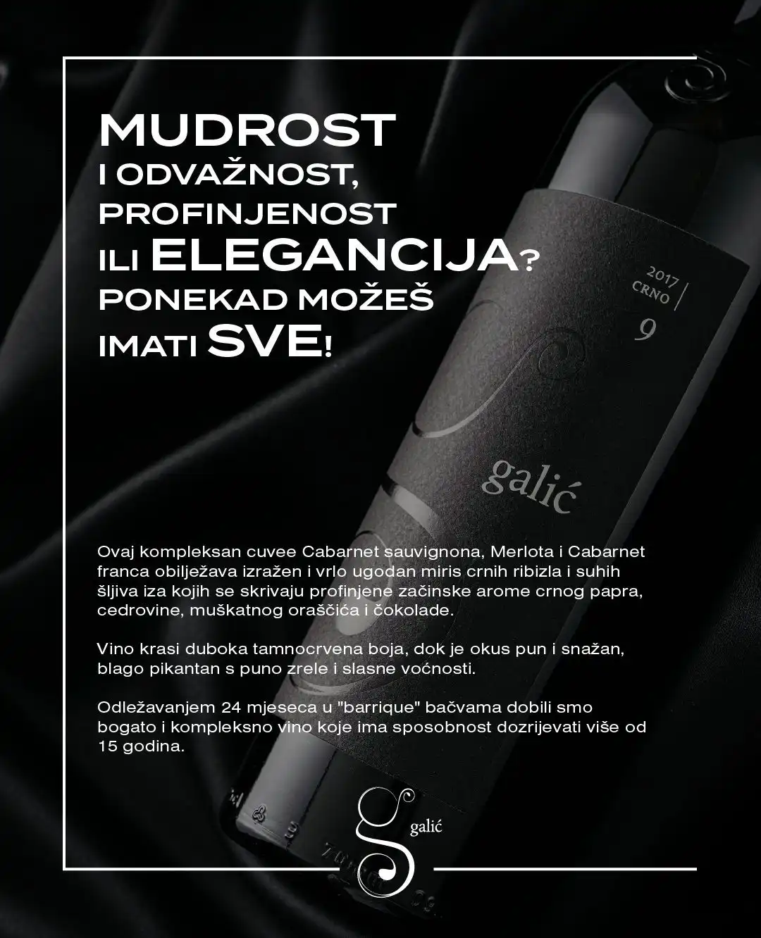 „Crno 9“ plod je rada našeg izuzetnog tima i vlasnika Josipa Galića koji su od samih početaka posvećeni postizanju vrhunske kvalitete i autentičnog okusa. Svaka boca „Crno 9“ nosi pečat vrhunskog kvaliteta, uz iznimnu pažnju posvećenu svakom koraku proizvodnog procesa, od odabira najboljih grožđa do precizne fermentacije i dozrijevanja.