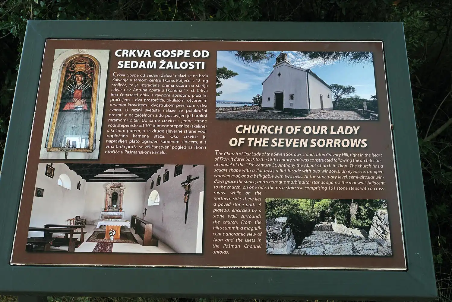 Boravite li više dana u Tkonu, jedan dan odaberite za sakralnu rutu ovim mjestom. Prva stanica neka bude Ćokovac, za turiste otvoren svaki dan od 16-18 sati. Do njega možete doći pješice,glagoljaškom stazom, biciklom ili automobilom. Koji god način odaberete pazite na odjeću – u samostanu vrijede jasna pravila i nije dopušten ulaz u majicama bez rukava kratkim hlačama. Po čemu je ovaj samostan toliko poseban? Dolazak benediktinaca na brdo Ćokovac dogodio se nakon mletačkog rušenja benediktinskog samostana u Biograda na moru 1125.godine. Brdo iznad Tkona postalo je novi dom samostana sv. Kuzme i Damjana koji je danas nulte kategorije i jedini je preostali muški samostan u Hrvatskoj.Jaki su centar glagoljaštva u Hrvatskoj i imaju najviše kamenih spomenika s rukopisom pisanih glagoljicom. Monasi s Ćokovca u Pragu su utemeljili glagoljaški benediktinski samostan “Emaus” kao zametak Praškog sveučilišta. U sakralnu turu dalje krenite u samom Tkonu. Kroz nju će vas provesti vodič Dražen kojem najavite da želite vidjeti crkve iznutra. Posebno će vas oduševiti mala crkvica Sv. Ante podignuta 1672.godine po oporuci glagoljaša mještanina Ante Palaškova. Oltarnu palu oslikao je poznati hrvatski slikar Celestin Medović u Firenci 1883 a upravo ona oduševljava. Naime na oltarnoj slici je prikazan lik Gospe kojoj noge obavija svijetli oblak a ispod nje u sredini je Sv. Ante.Njemu desno je sv. Metod a lijevo sv. Ćiril. Ova crkvica je otvorena svega nekoliko puta godišnje, ali njezino zvono svakog dana označava podne. Od crkve Sv. Ante laganom šetnjom možete doći do Župne crkva sv. Tome koja je podignuta na temeljima crkve sv Marije u 11st.U današnjem obliku trobrodne bazilike sagrađena je 1742 a obnovljena 1938.godine. I na kraju – spomenuta ‘čuvarica’ Tkona, crkva Gospe od sedam žalosti s križnim putem ‘Kalvarijom’ nalazi se na brdašcu s kojeg puca pogled sve do Zadra. Jedna od legendi ovog kraja kaže kako se brdo nazvalo Kalvarijom zbog mnogih djevojaka koje su brdo posjećivale želeći vidjeti dolazi li njihov mornar s daleke pučine. S ovog mjesta se kamenim stepenicama lako spustiti u strogi centar Tkona.