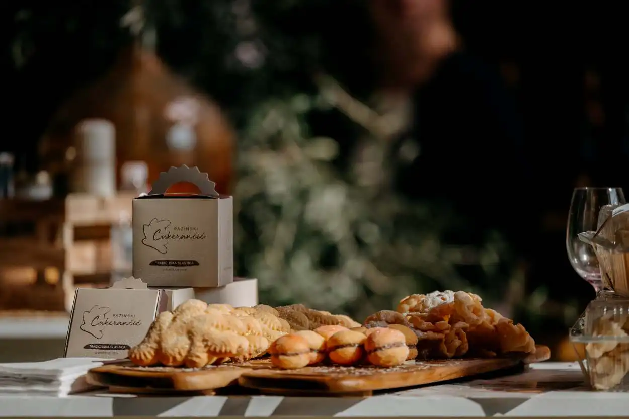 Posjetitelji su kušali i tradicionalne slastice, među kojima su bili pazinski cukerančići, barbanski svadbeni kolač i žminjske kristove krune, čime je dodatno istaknuta lokalna priča središnje Istre. U suradnji s Inventosom i njezinom vlasnicom Lenkom Šajina osmišljen je i realiziran koncept kojim su se lokalne slastice predstavile kao važan dio vjenčane i destinacijske ponude.