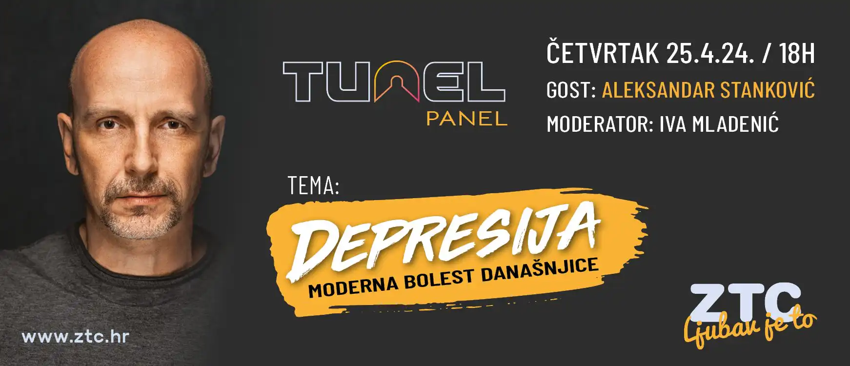 Prvi gost Tunel-Panel radionice je poznato lice tv ekrana, Aleksandar Stanković. Urednika i voditelja emisije NU2 ne treba posebno predstavljati. No, ovoga puta on dolazi u Rijeku, u ZTC i kao autor knjige „Depra“. „Depra“ je iskren opis autorove borbe sa depresijom. Vjerujemo da će razgovor s Aleksandrom koji otvoreno progovara o svojoj najvećoj slabosti, pomoći mnogima koji se suočavaju sa sličnim problemima.