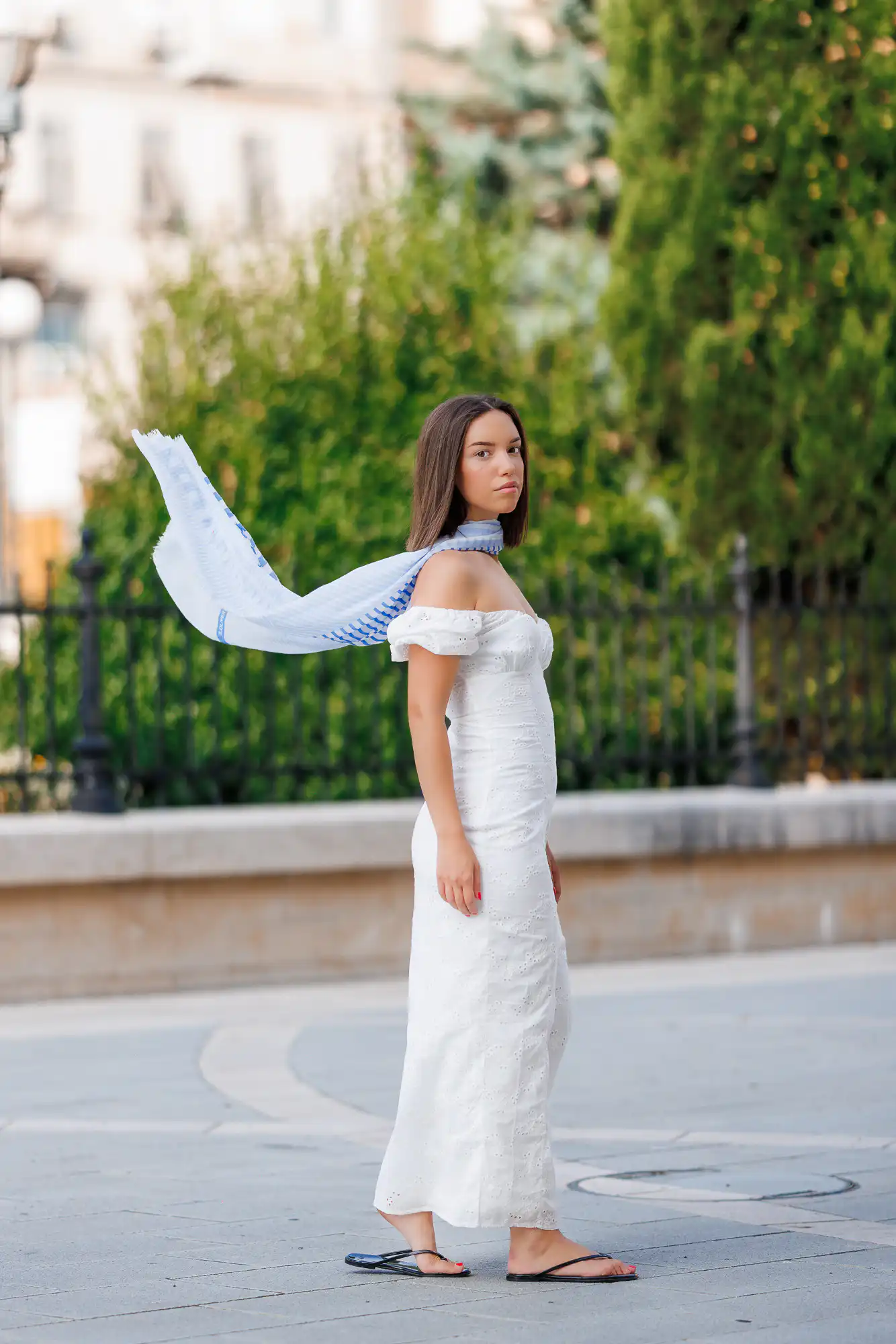 Teško bi bilo zamisliti ljeto bez bijele haljine. Pronašli smo lepršavi i lagani model u trgovini New Yorker (prije 29,99 eura, SADA: 19,99 eura) koja u ovom dijelu godine ima sjajna sniženja. Ovo je onaj odabir kad imate poziv u zadnji tren i kad samo trebate navući haljinu i pobjeći u gradsko uživanje! Marama je iz trgovine s.Oliver (prije 18,19 eura, SADA: 13,00 eura).